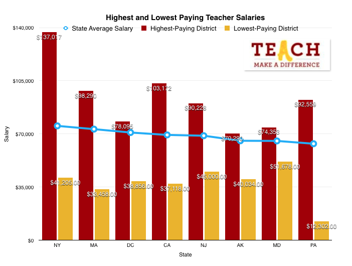 It seems that one of the determining factors for rate-of-pay comes down to your zip code. Here is a look at some of the highest — and lowest — paying districts and schools in the best compensating states for teachers: