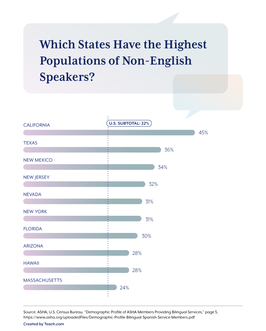 Percentages of individuals who spoke a language other than English as their primary language at home in 2018 were highest in California (45%); Texas (36%); New Mexico (34%); New Jersey (32%); New York; Nevada (31% each); New York (31%); Florida (30%); Arizona (28%); Hawaii (28%) and Massachusetts (24%).